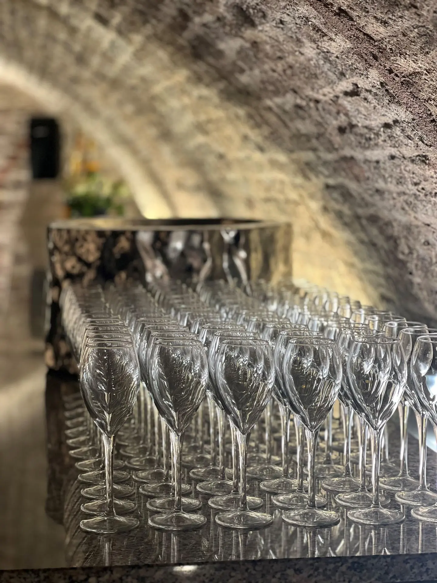 De betoverende champagnekelder met prachtige verlichting is onderdeel van onze ondergrondse gewelven. Dankzij sfeerverlichting en een stijlvol design is deze geklimatiseerde ruimte heel geschikt voor bijeenkomsten en proeverijen tot circa 20 personen. Een proeverij met uitsluitend champagne behoort ook tot de mogelijkheden.