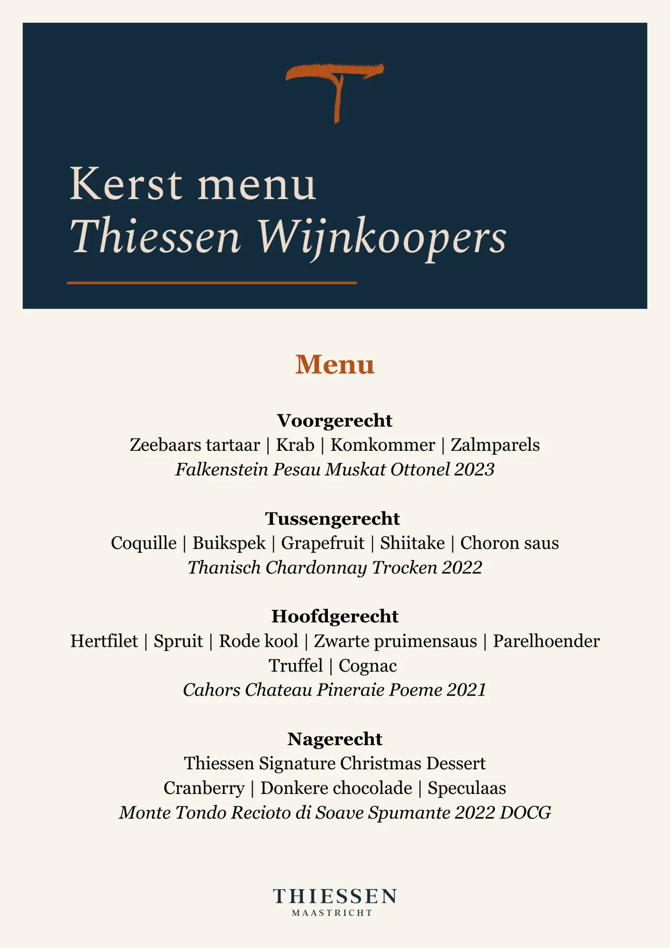 Bij Thiessen wordt kerst een culinaire belevenis. Laat u verrassen door onze 4-gangen kerstlunch of het 4-gangen kerstdiner.